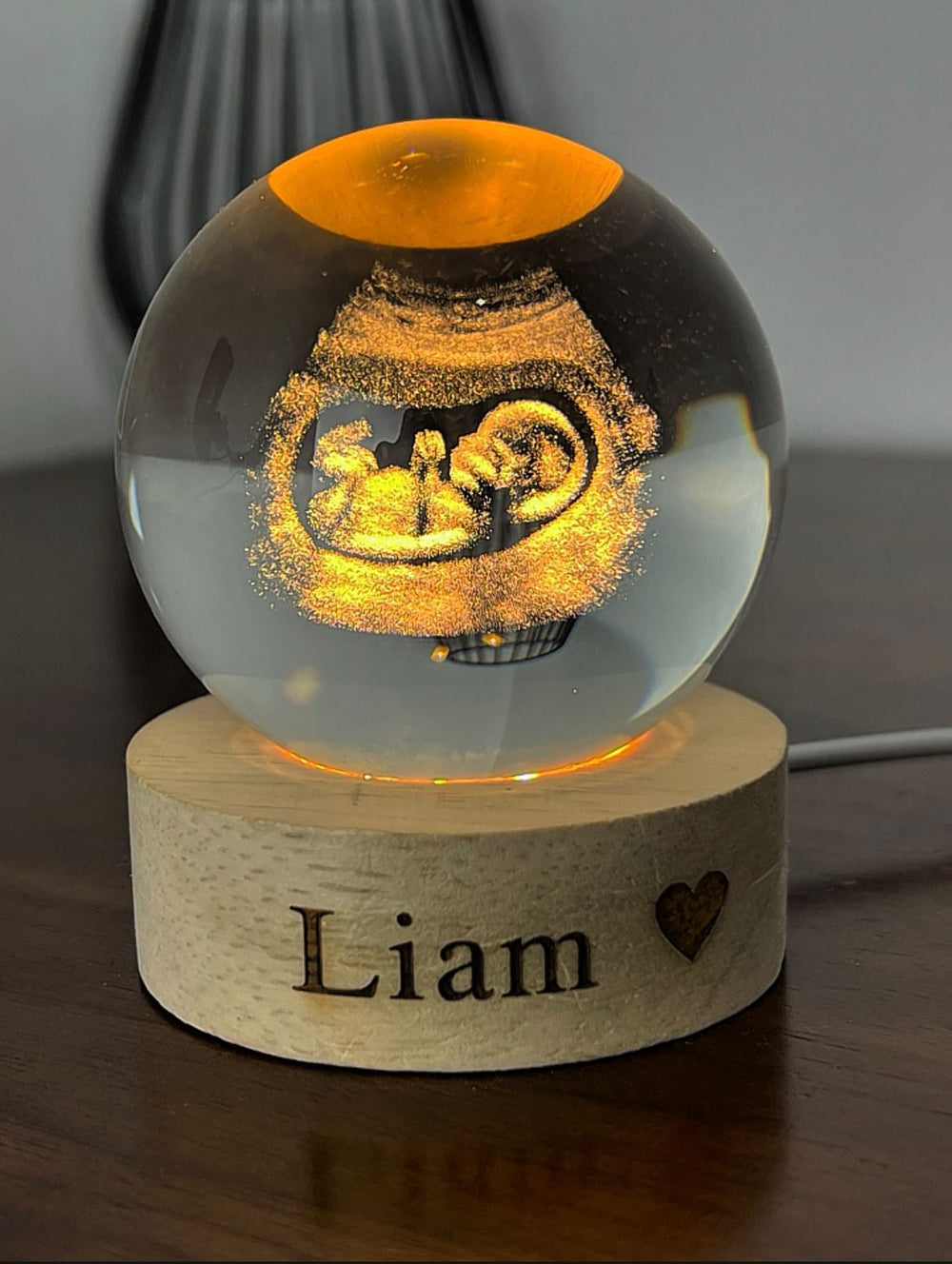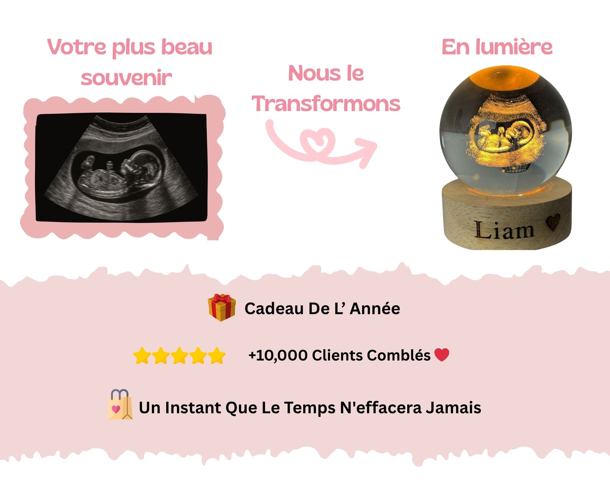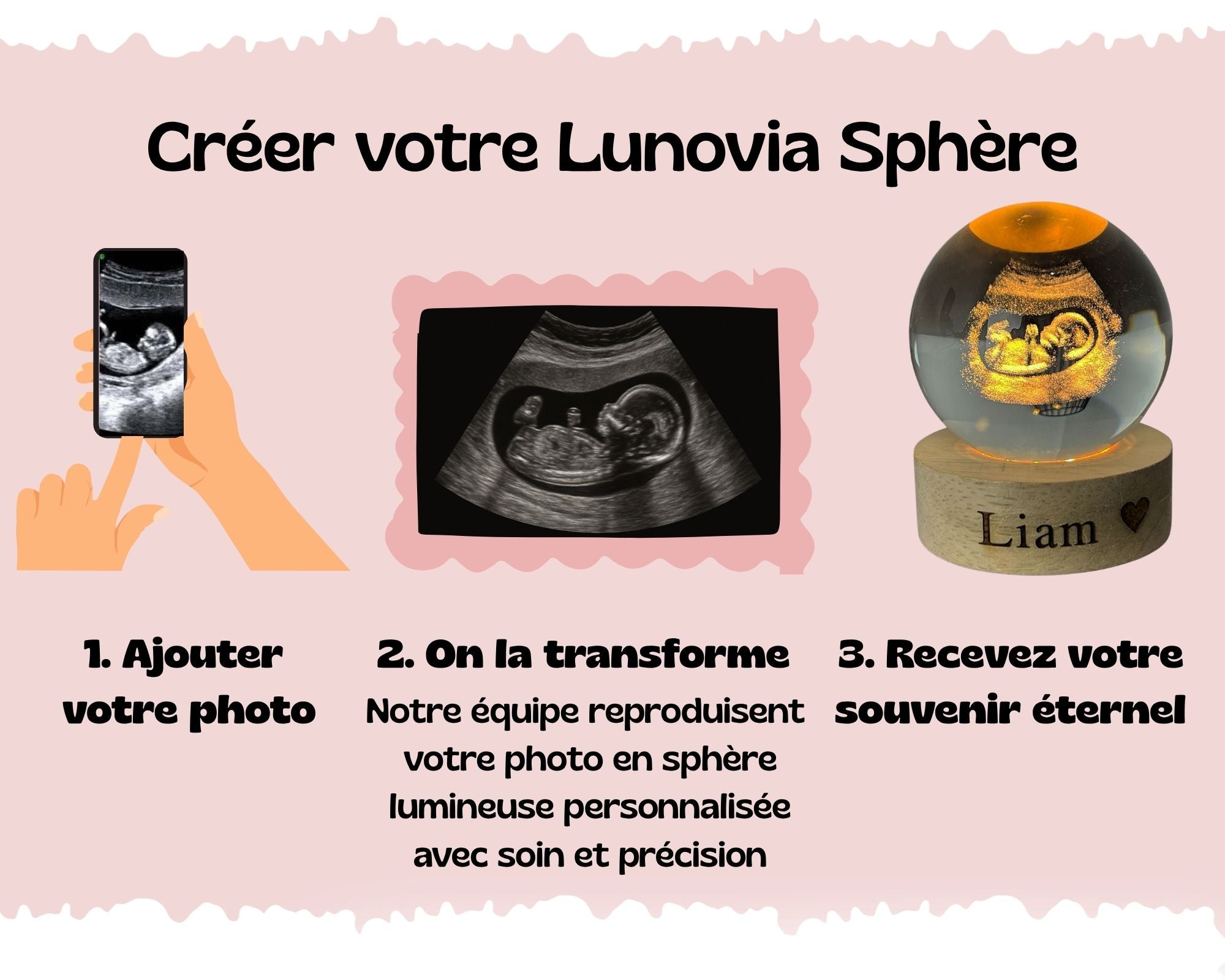 Votre échographie n’était qu’une image fragile, avec Lunovia elle devient une œuvre d’art intemporelle — une sphère en verre cristallin, délicatement gravée et illuminée par une douce lumière.